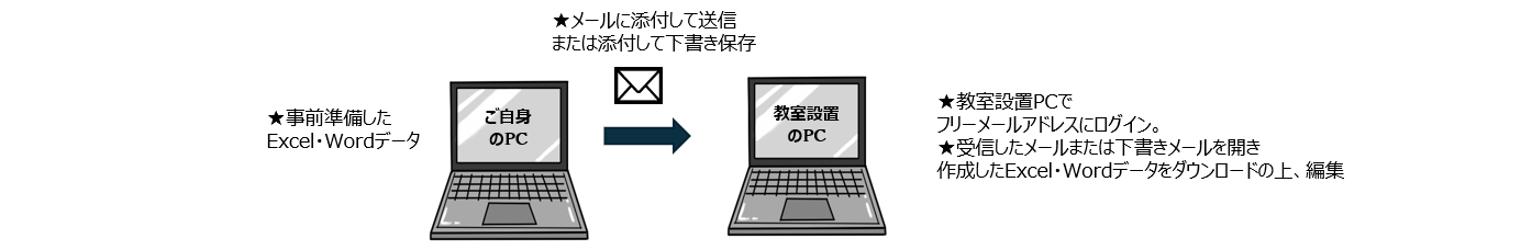 ・G-mailやiCloud等フリーメールアドレスに教室設置PCからログインできるよう、パスワードを事前に準備してください。(当日お忘れなくご持参ください。)